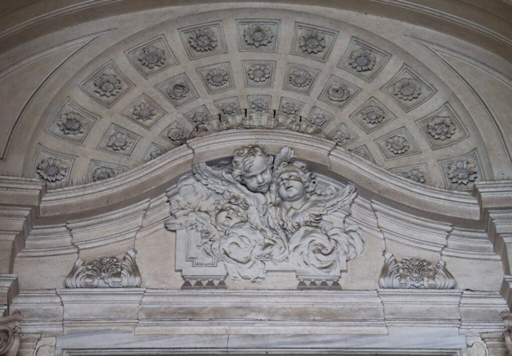 La Cathédrale de Lecce est un ensemble complexe où chaque chapelle latérale recèle une histoire. La Cappella del Santissimo Sacramento, dans le chœur, est remarquable pour son tabernacle en argent ciselé et son baldaquin en marbre polychrome. C’est un bon exemple de l’art sacré qui vise à concentrer l’attention du fidèle sur l’Eucharistie : stucs dorés, anges en relief et une petite coupole peinte qui représente la gloire céleste. Les vitraux supérieurs, bien que modestes, filtrent une lumière qui met en valeur les marbres incrustés.